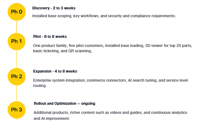 That is no longer the case. A pragmatic rollout — starting with a pilot on a product family or a small customer group — delivers measurable return through faster service, fewer site visits, and increased spare-parts revenue. The technology stack is mature and integrates with existing enterprise systems without requiring a complete rebuild.