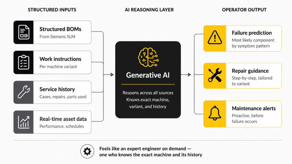 When Generative AI has access to structured BOMs, work instructions, service history, and real-time asset data sourced directly from Siemens PLM, it can do far more than surface information. It can reason about it – enabling manufacturers to offer their operators: