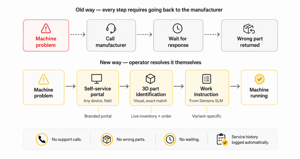 This continuity between design and operations creates a feedback loop that benefits both sides. Engineering teams gain insight into how products perform in real conditions. Service teams gain access to the precise engineering context that makes diagnosis and repair faster and more accurate. And operators gain a transparent, self-service experience that builds confidence in the manufacturer’s long-term support – without having to pick up the phone or wait for an engineer.