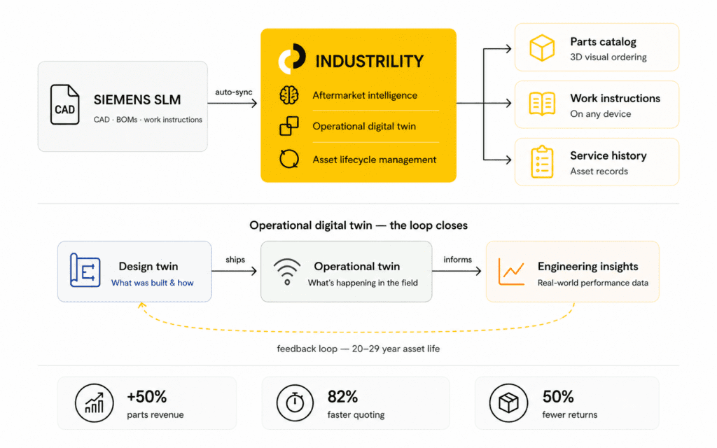 For manufacturers who have already invested in Siemens, the opportunity is immediate. The engineering foundation is already there. Industrility‘s deep integration with Siemens PLM brings the aftermarket layer: the operator self-service portal, the parts commerce, the service workflows, the asset intelligence – and connects it all back to the same engineering record that defined the product from day one.
