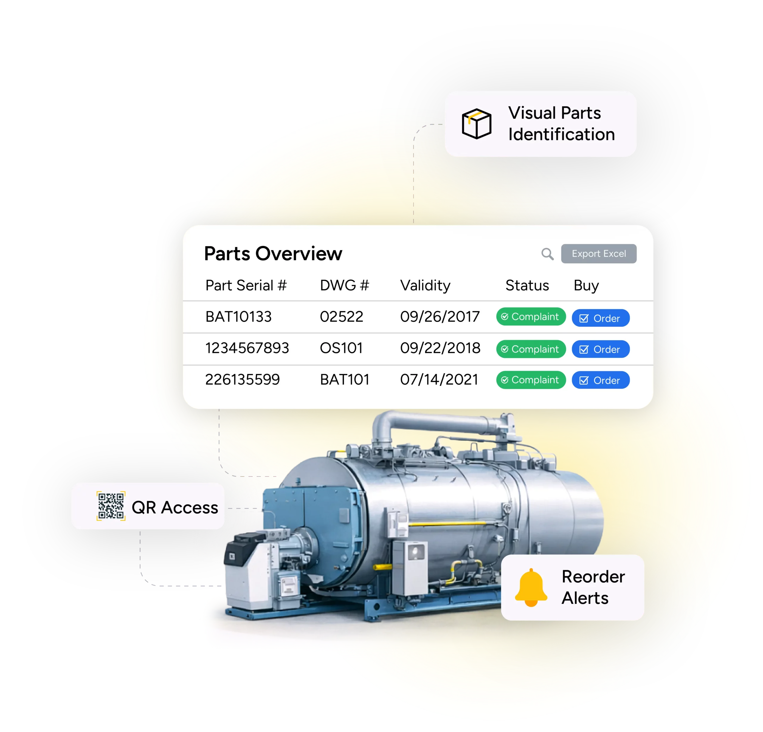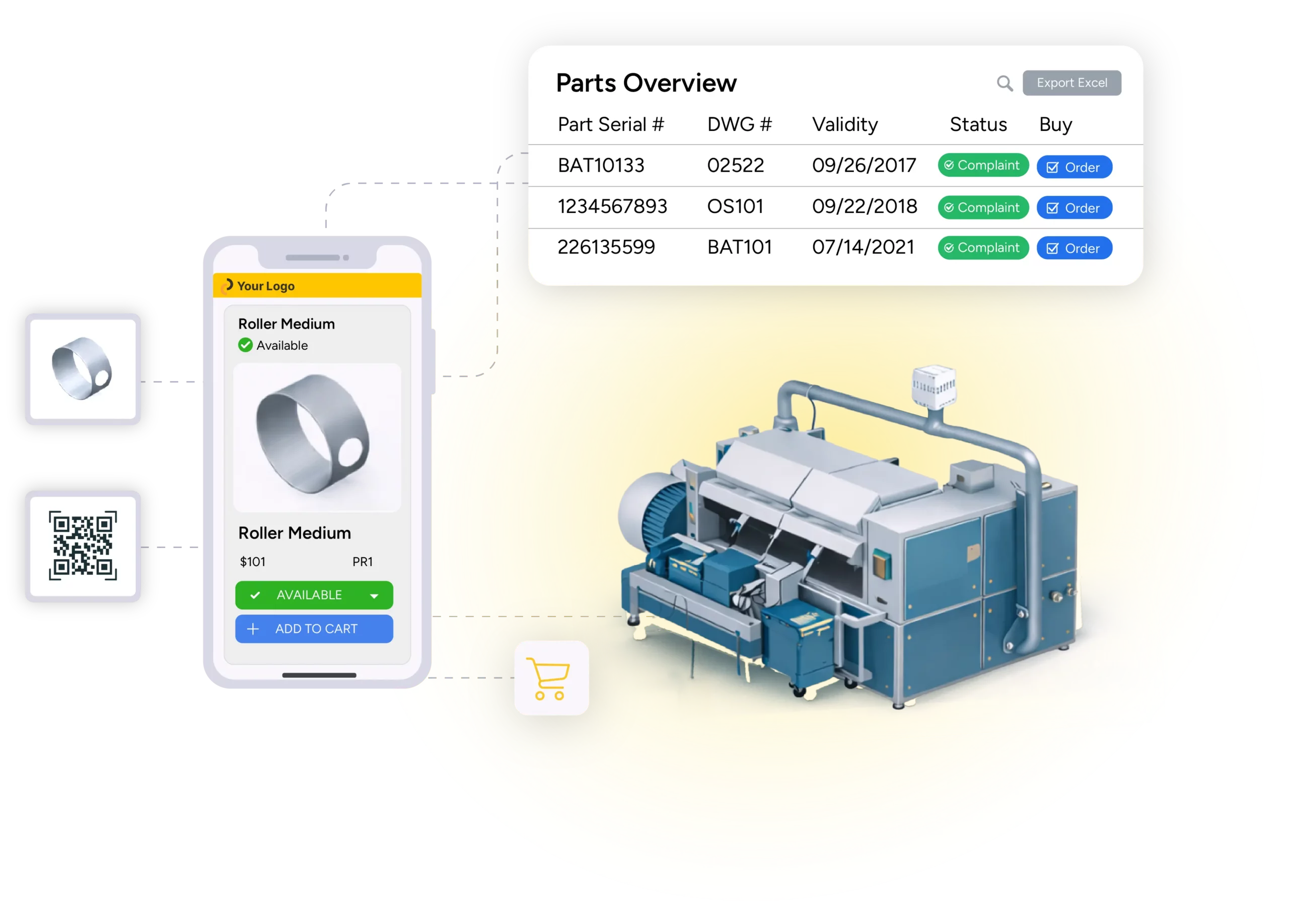 Identify parts, validate compatibility, and order in seconds with QR codes for instant shop-floor access.